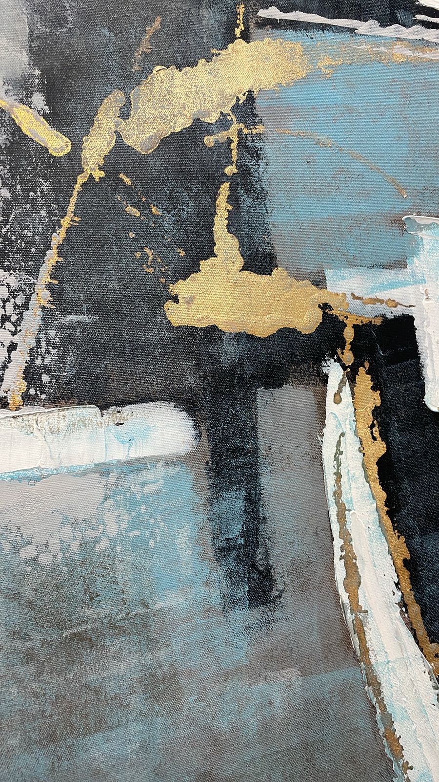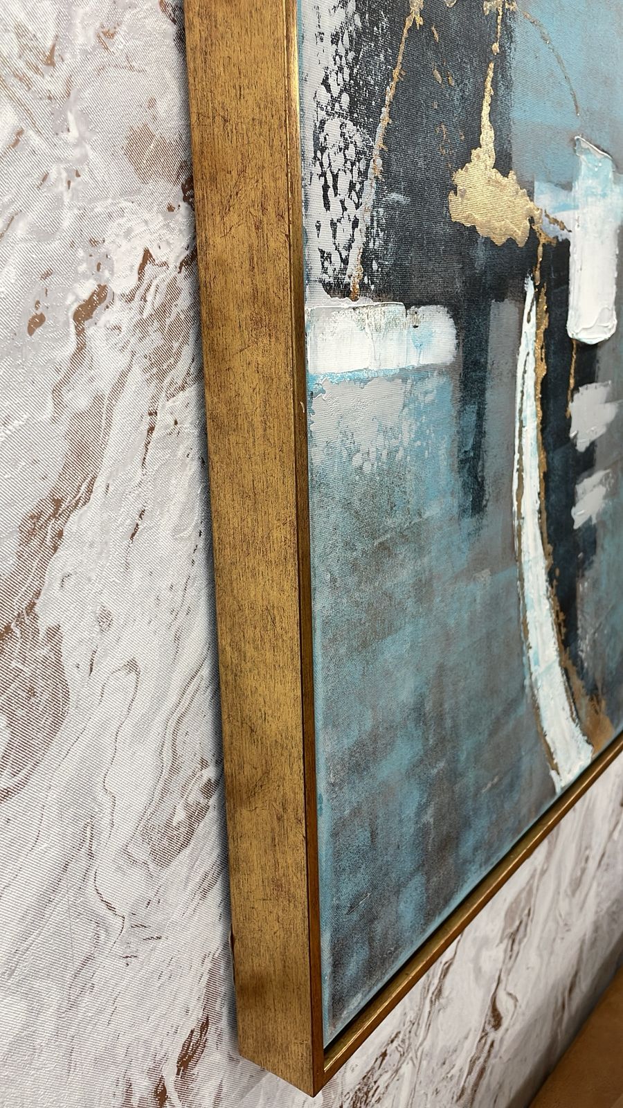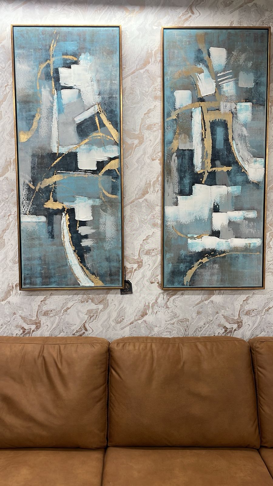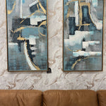 SET DE 2 CUADROS DE PINTURA ABSTRACTA CON TONOS AZULES, DORADOS Y GRISES CON MARCO DORADO