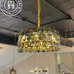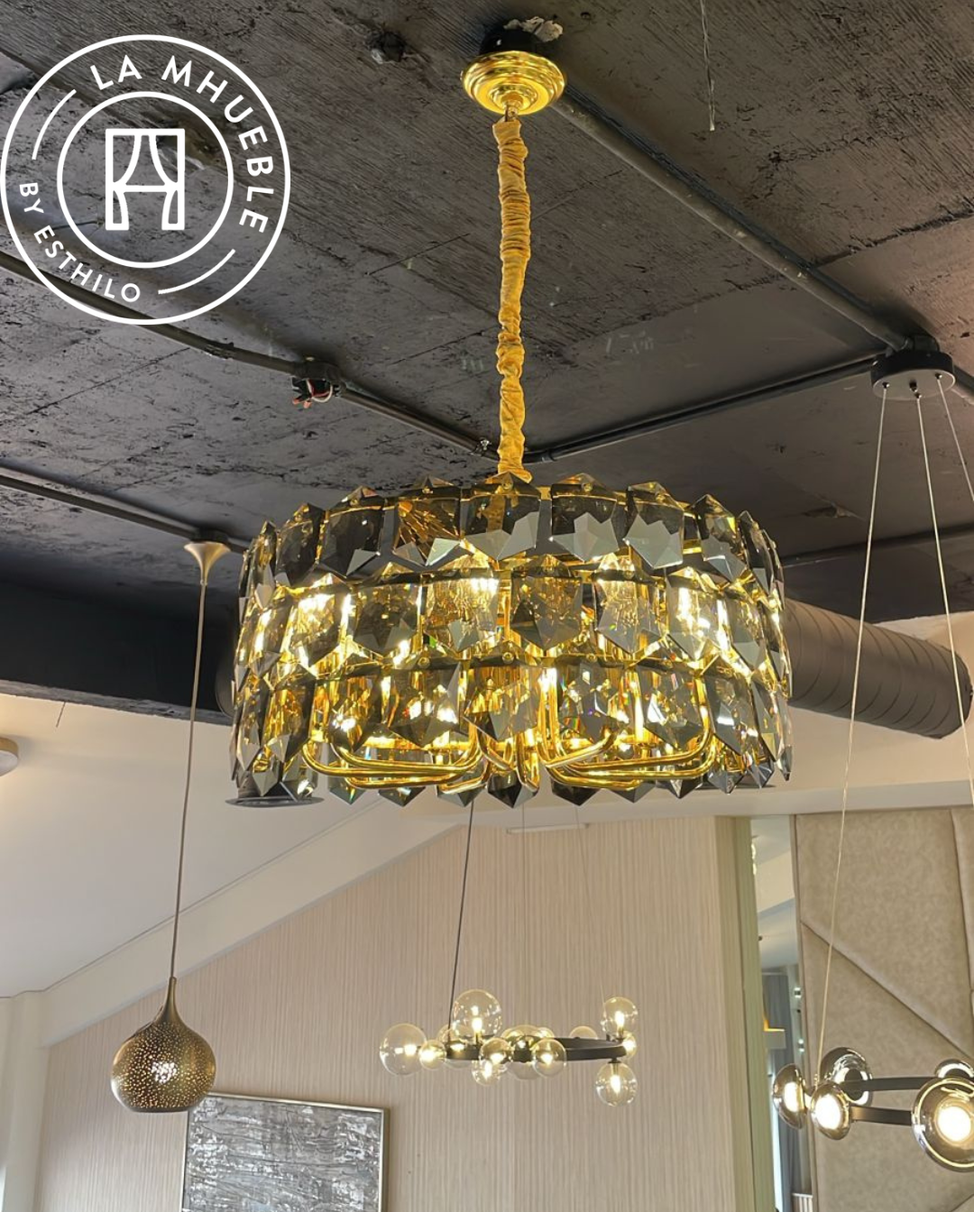 CANDELABRO CON 3 FILAS DE ESPEJOS DESLUMBRANTES 10 BOMBILLAS CON ESTRUCTURA DE HERRERIA DORADA