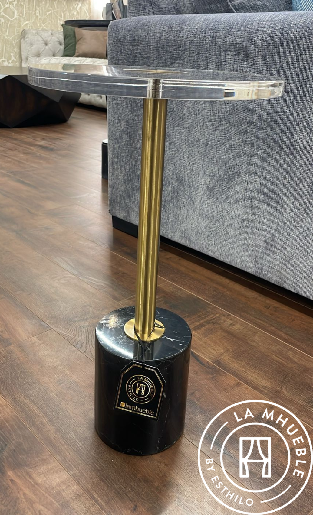 MESA PEQUEÑA LATERAL DE BASE DE MARMOL COLOR NEGRO, ESTRUCTURA DE HERRERIA Y SUPERFICIE DE CRISTAL
