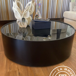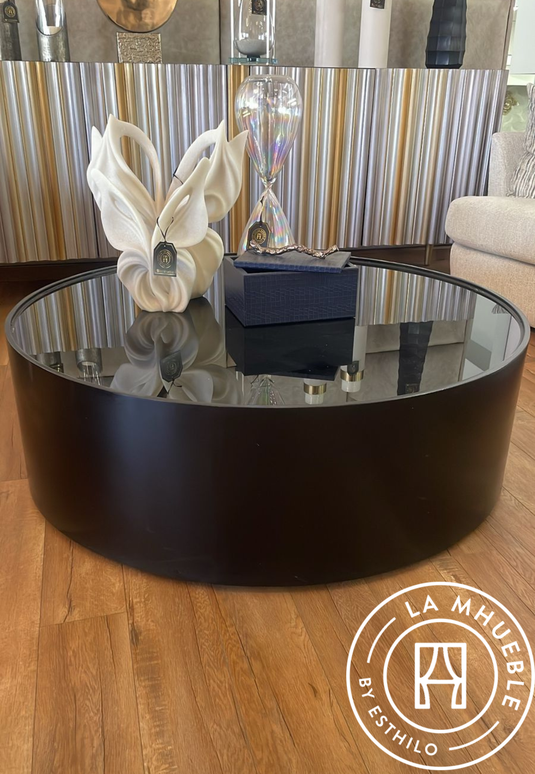 MESA DE CENTRO CON ESTRUCTURA DE MADERA Y SUPERFICIE DE VIDRIO COLOR NEGRA