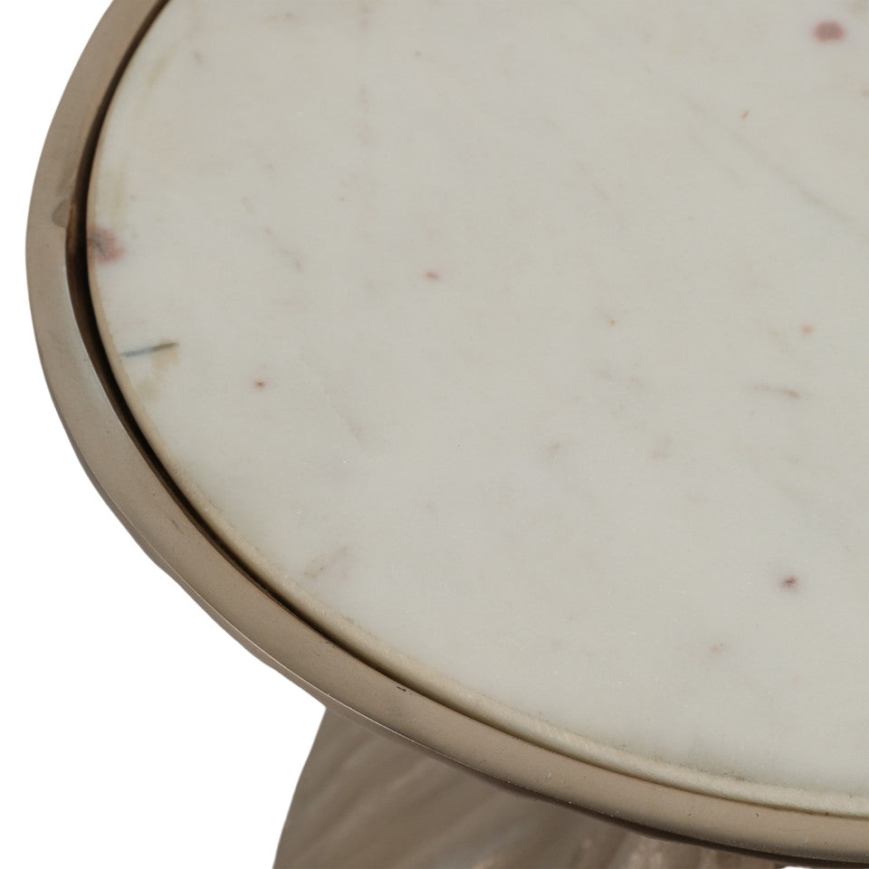 MESA LATERAL MODERNA CON DISEÑO EN ESPIRAL DE METAL COLOR PLATA Y SUPERFICIE DE MARMOL BLANCO