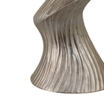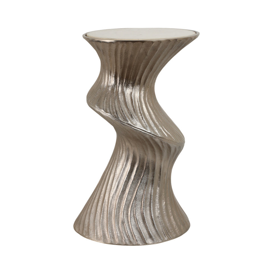 MESA LATERAL ALTA CON DISEÑO EN ESPIRAL DE METAL COLOR PLATA Y SUPERFICIE DE MARMOL BLANCO