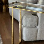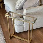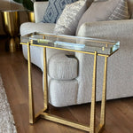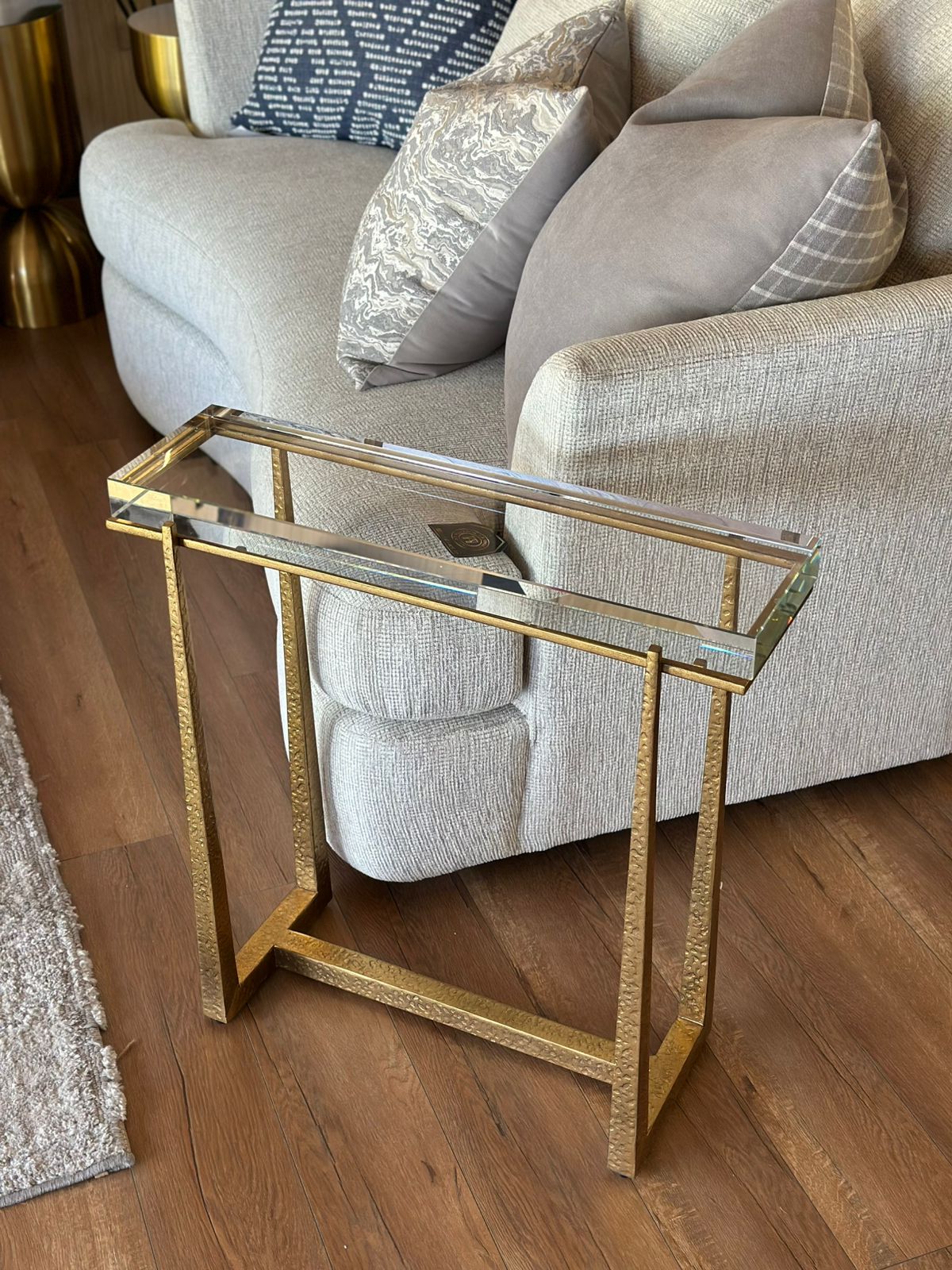 MESA AUXILIAR REACTANGULAR CON SUPERFICIE DE CRISTAL GRUESO Y BASE DE HERRERIA DORADA