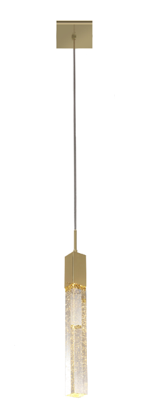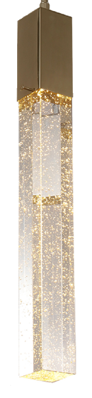 LAMPARA COLGANTE INDIVIDUAL EN FORMA DE LINGOTE CON ESTRUCTURA METALICA COLOR DORADA Y CON PANTALLA DE CRISTALERIA CON DISEÑO DE BURBUJAS POR DENTRO