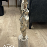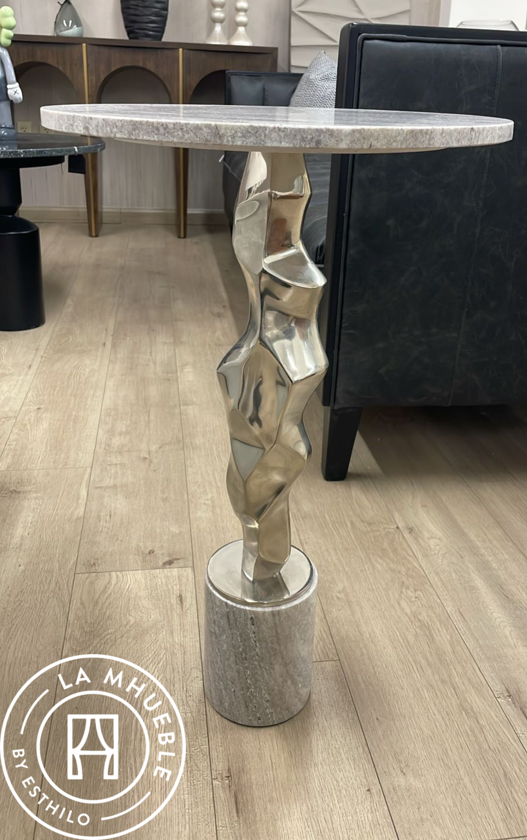 MESA LATERAL CON BASE DE MARMOL, ESTRUCTURA DE HERRERIA Y SUPERFICIE DE MARMOL COLOR PLATA