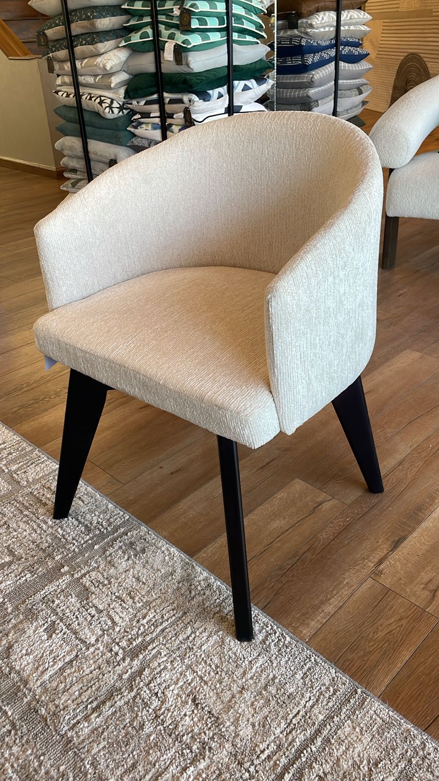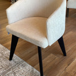 SILLA DE RESPALDO SEMICURVO DE TELA TIPO TERCIOPELO COLOR IVORY CON BASE DE MADERA COLOR NEGRA
