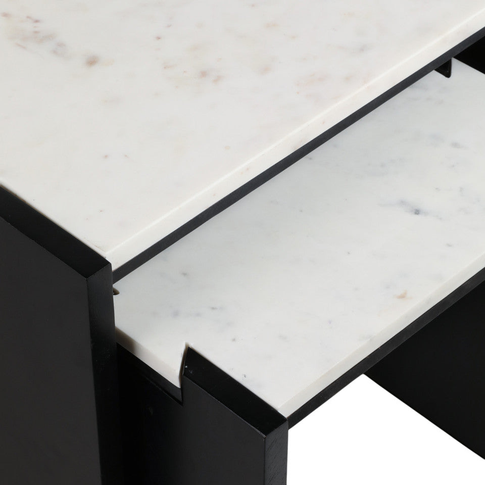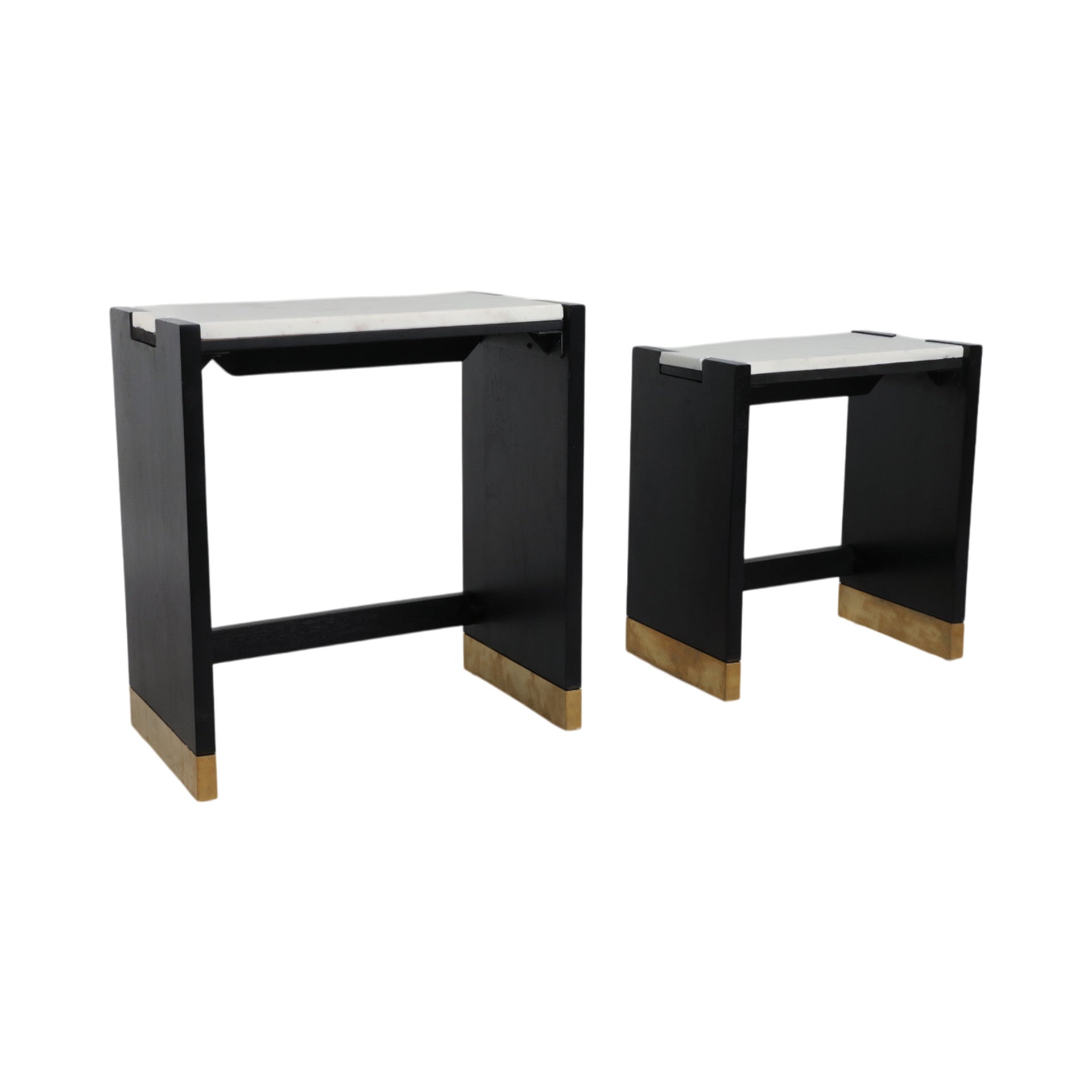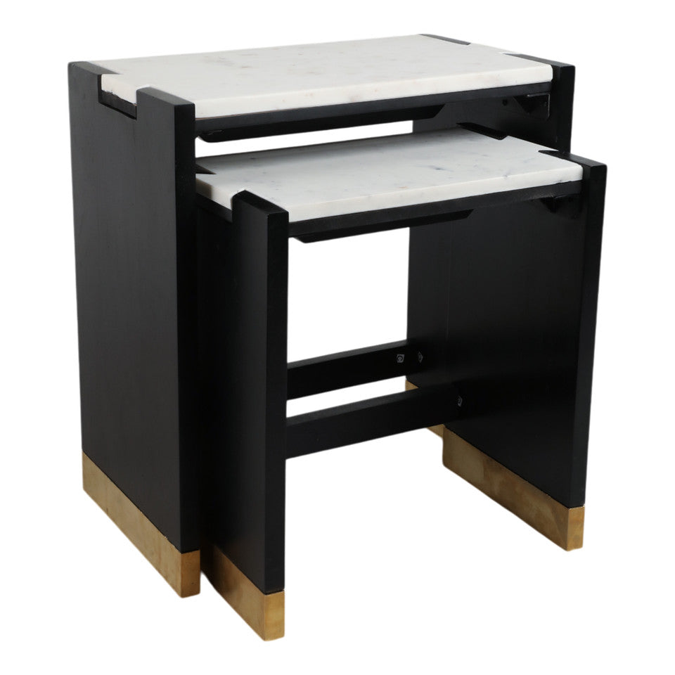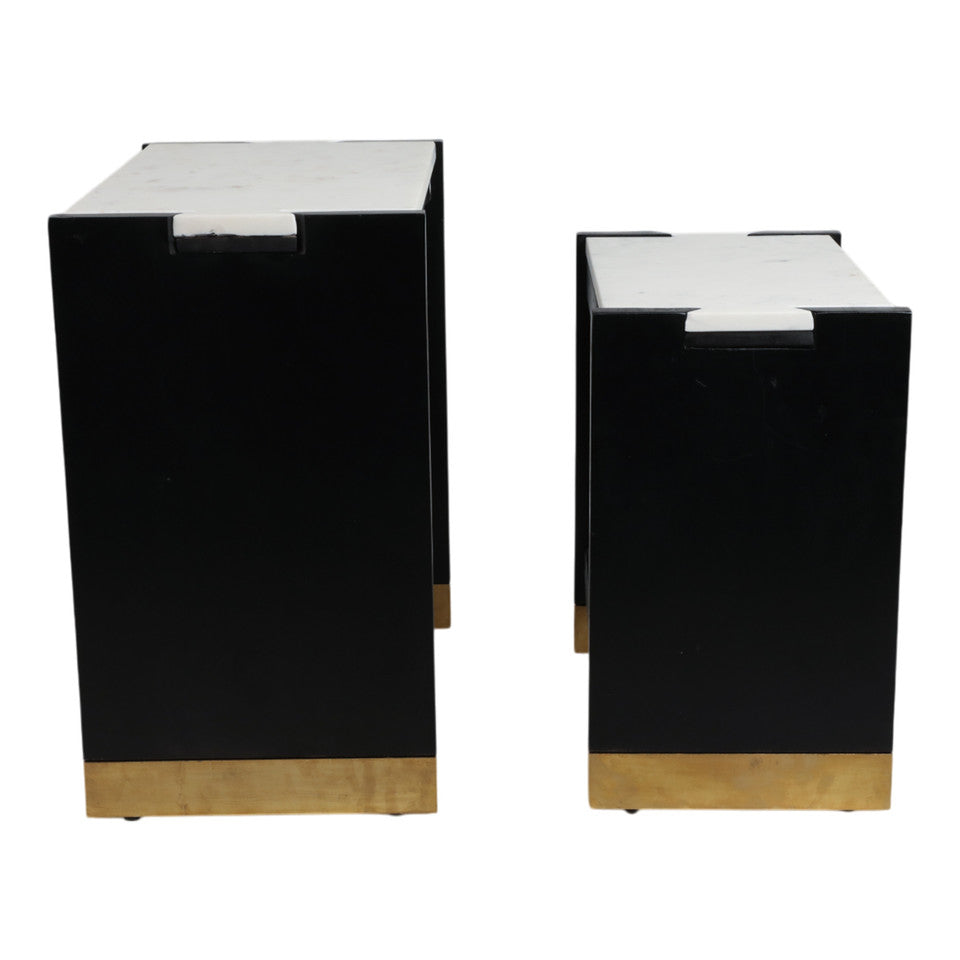 SET DE 2 MESAS DE CENTRO CON ESTRUCTURA DE MADERA NEGRA, BASE DE HERRERIA DORADA Y SUPERFICIE DE MARMOL BLANCO