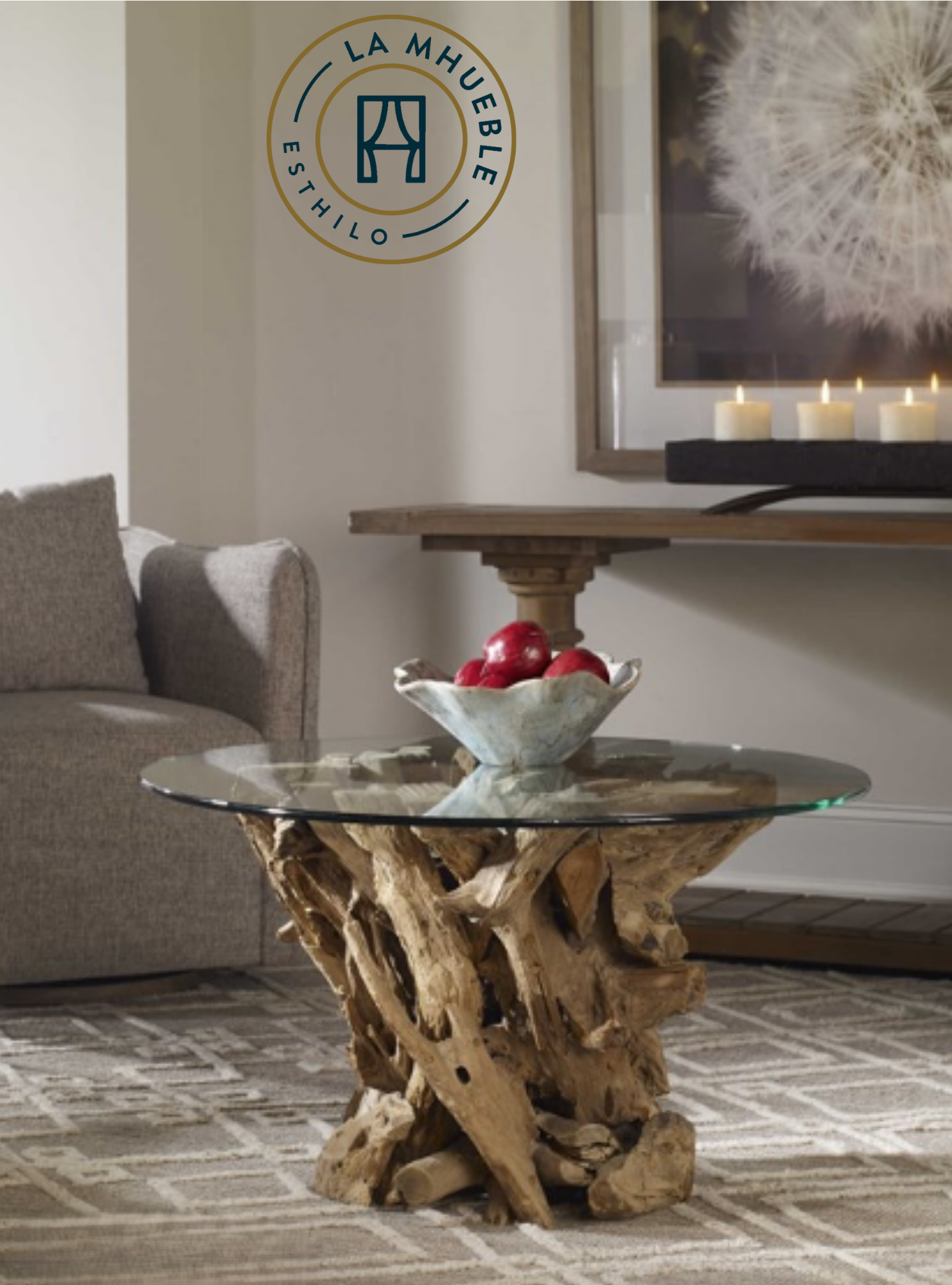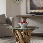 BASE EN MADERA EN FORMA DE TRONCO Y CUBIERTA DE CRISTAL TRANSPARENTE